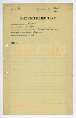 › Lautarchiv PK1127_0007 Detailangaben Eintragstyp Schriftdokumente ID 55316 Verschlagwortung Verknüpfte Sammlungsobjekte Frankoprovenzalisch (Frankreich), Erzählung - PK 1127 (Tondokumente) Dokumentation PK